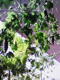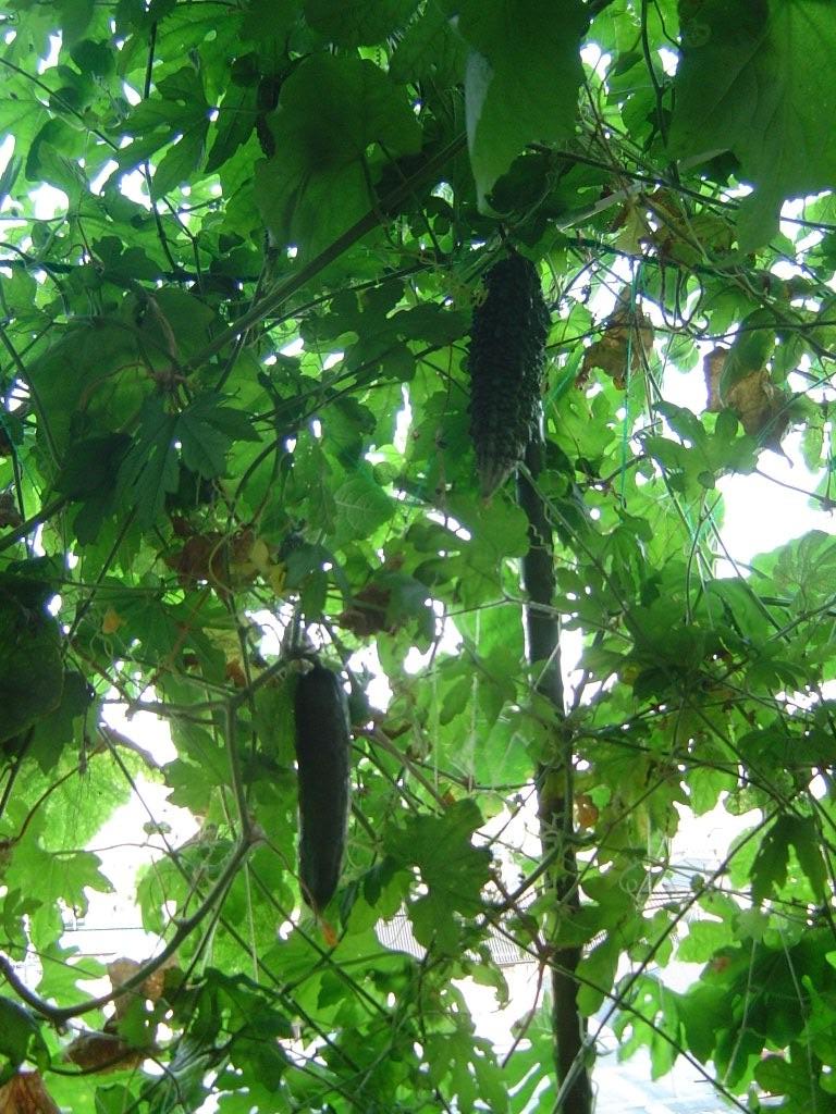 ゴーヤは調理しても人気がイマイなのと、カーテンにするのが目的なので、実がつかないようにとってしまうんですが、隠れてここまで大きくなったヤツがいた。